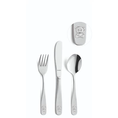 Deze 3-delige bestekset van Amefa is speciaal gemaakt voor kinderen vanaf 3 jaar. De set bestaat uit een vork, mes en lepel, met een vrolijke beer op het handvat. De normaal scherpe delen van het mes en de vork zijn afgerond, zodat ze veilig te gebruiken zijn voor kinderen. Elk kind zal met deze set trots zijn op het eigen bestek en met plezier leren om zelf met bestek te eten. Het bestek heeft een hoogglans afwerking en is vaatwasmachinebestendig.