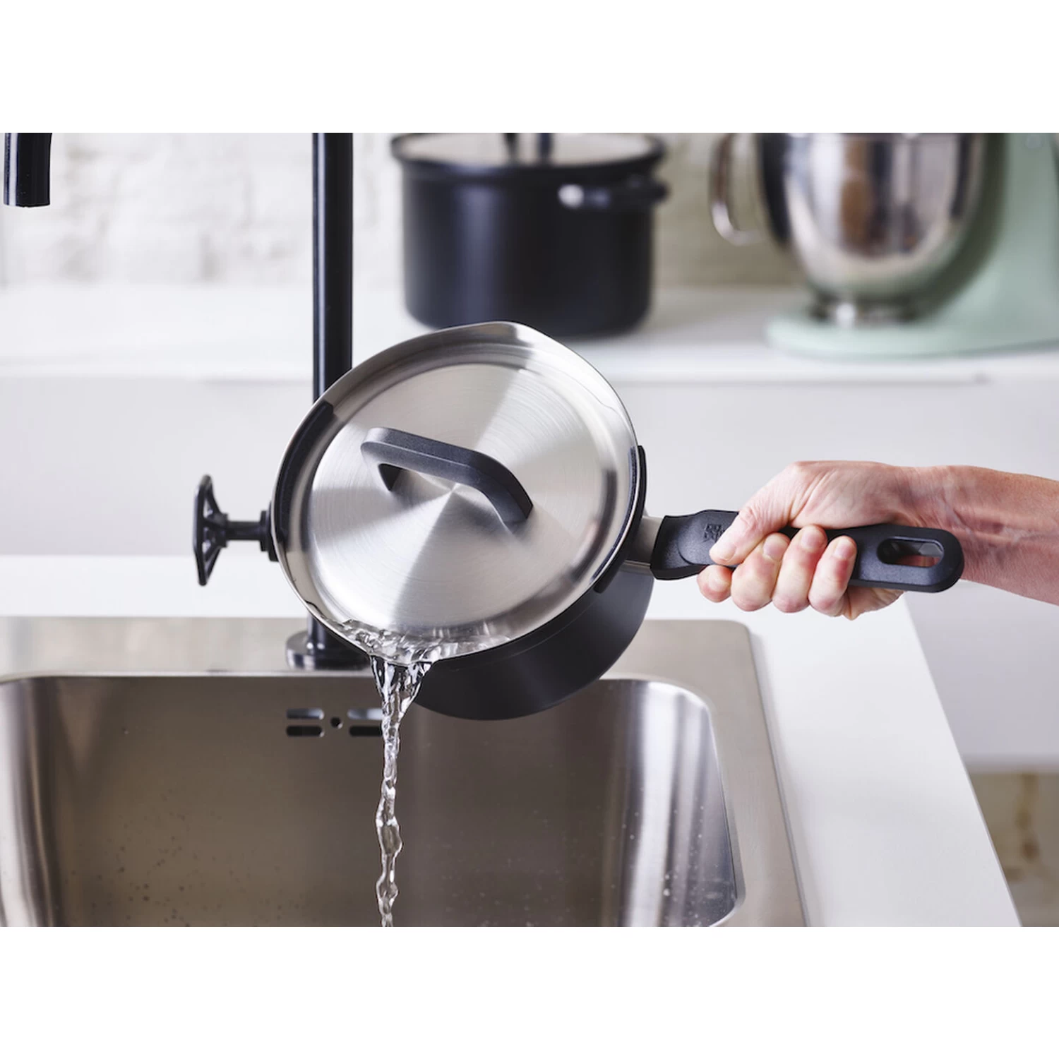 - Uniek afgietsysteem. Met een simpele kwartslag draai, vergrendeld de deksel onder de zwarte siliconen stoppers
