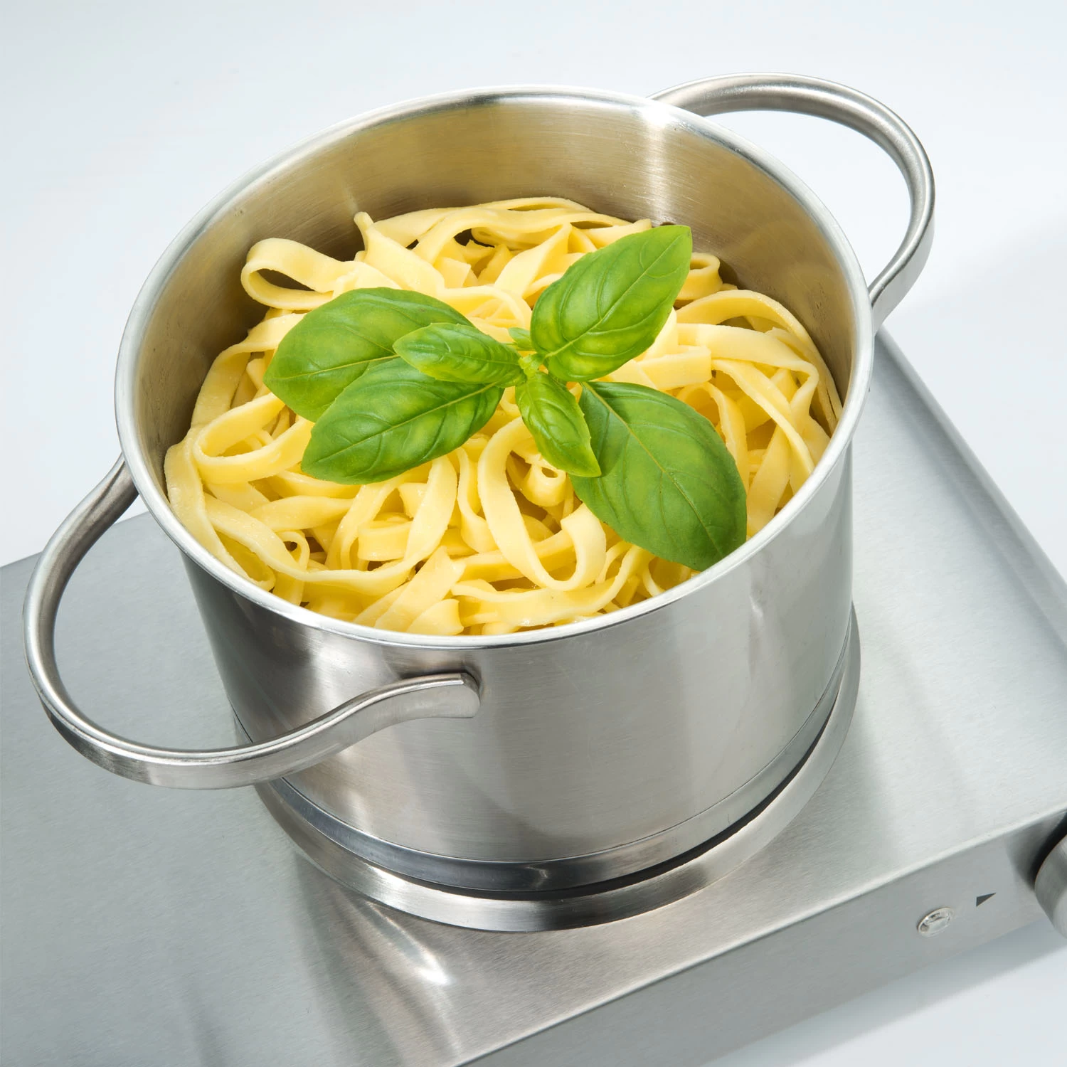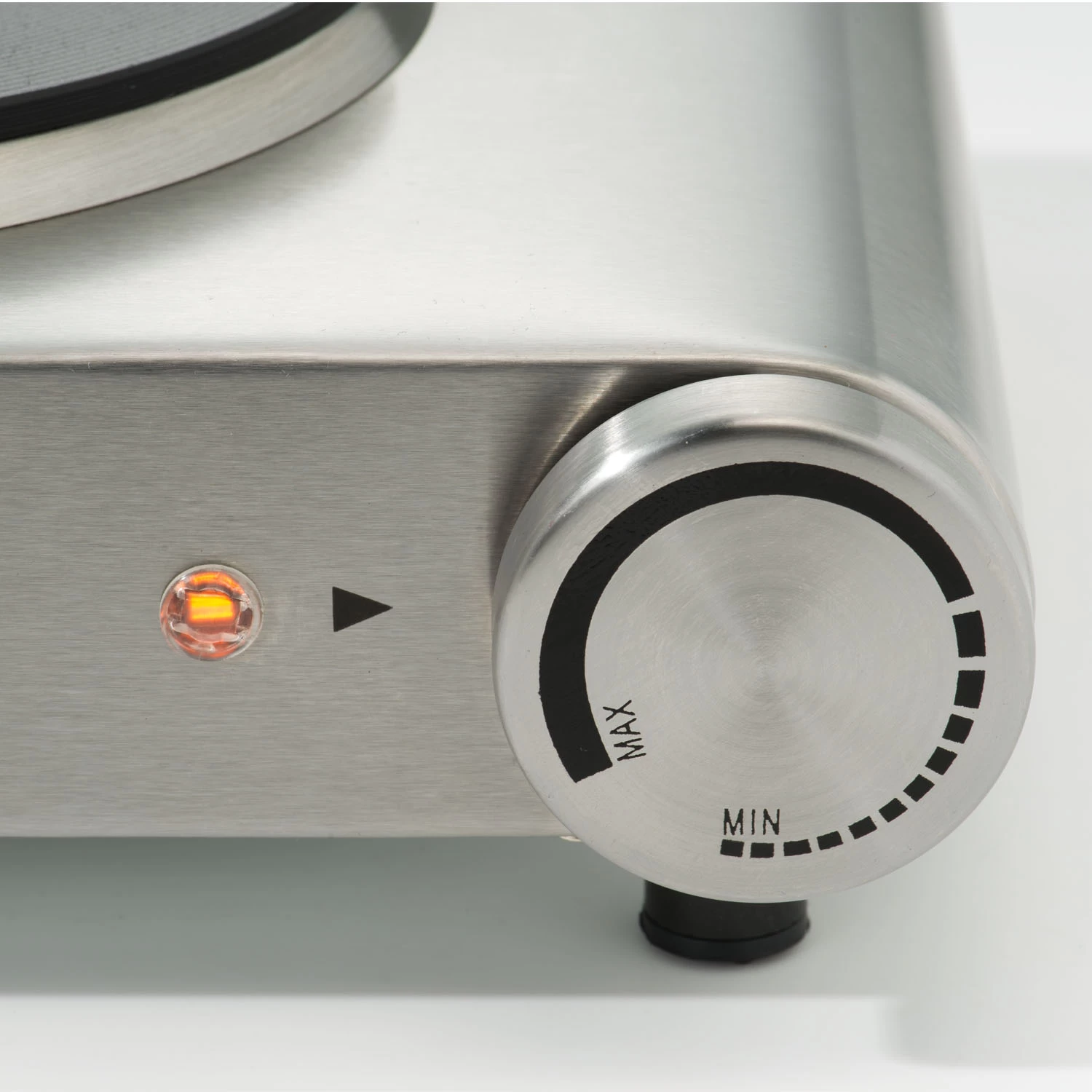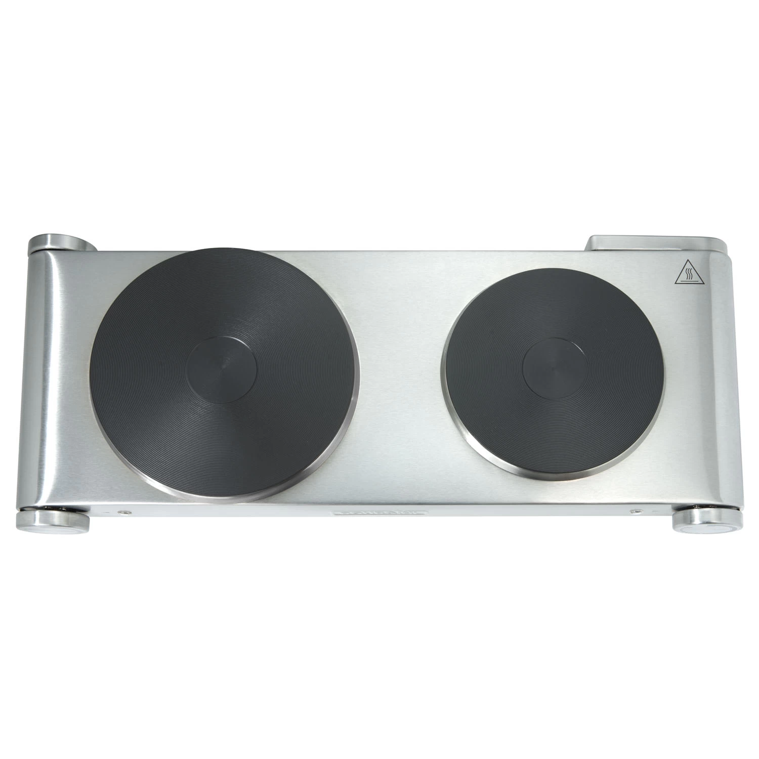 Bourgini duo kookplaat. Kookplaat me RVS design en twee kookplaten. De kookplaten hebben een diameter van 19 en 19 cm en werken op 1000 en 15000 Watt. De temperatuur is instelbaar, en de kookplaat heeft twee powerla,pjes. De kookplaat is geschikt voor alle standaardmaten pannen en heeft anti-slipvoetjes, zodat je altijd veilig kunt koken.