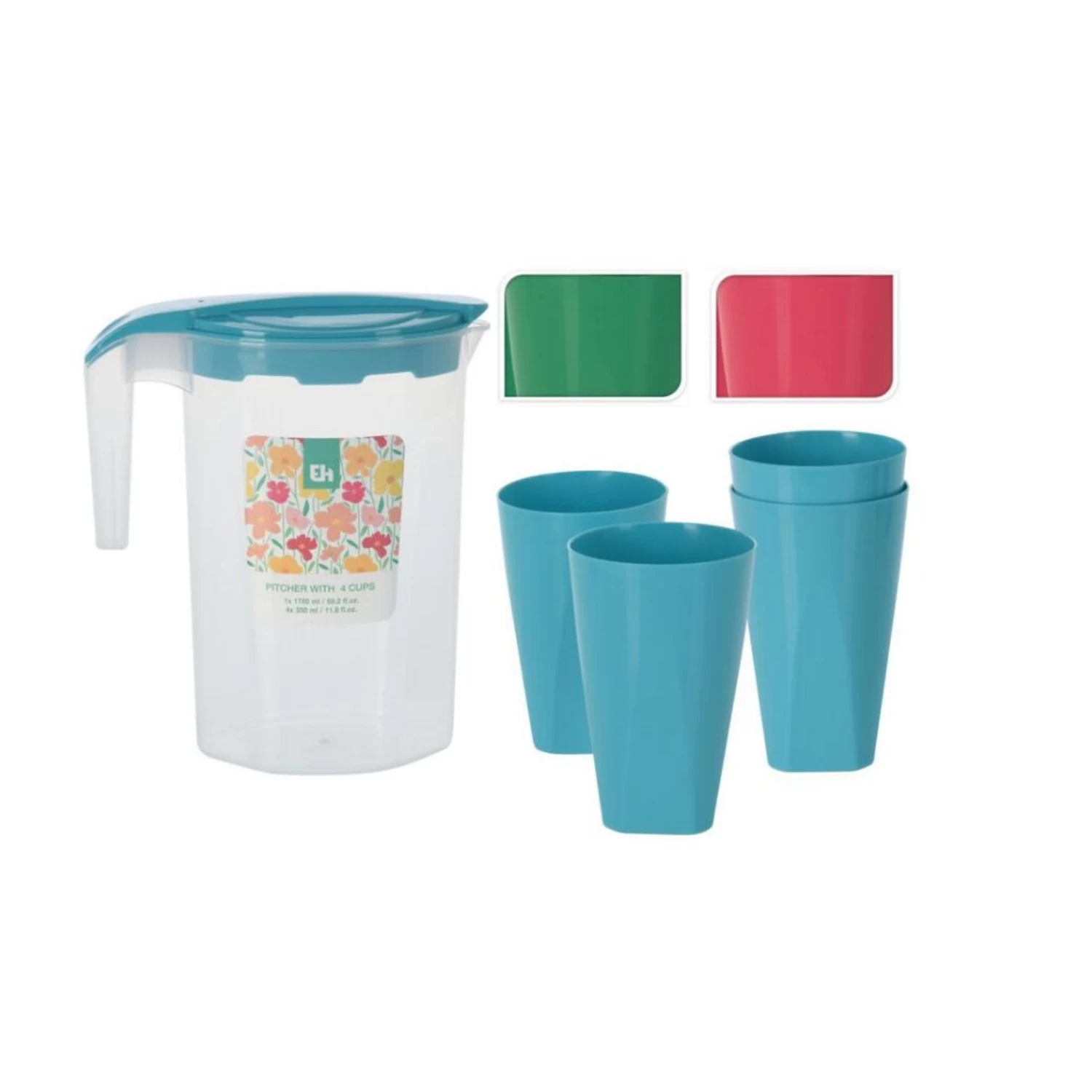 Handig voor een feestje of picknick, de Excellent Houseware schenkkan met 4 glazen. De schenkkan heeft een inhoud van 1,75 liter en is voorzien van een deksel. Dit product is verkrijgaar in 3 verschillende kleuren (groen, blauw, roze). Welke kleur je ontvangt is helaas vooraf niet te bepalen.