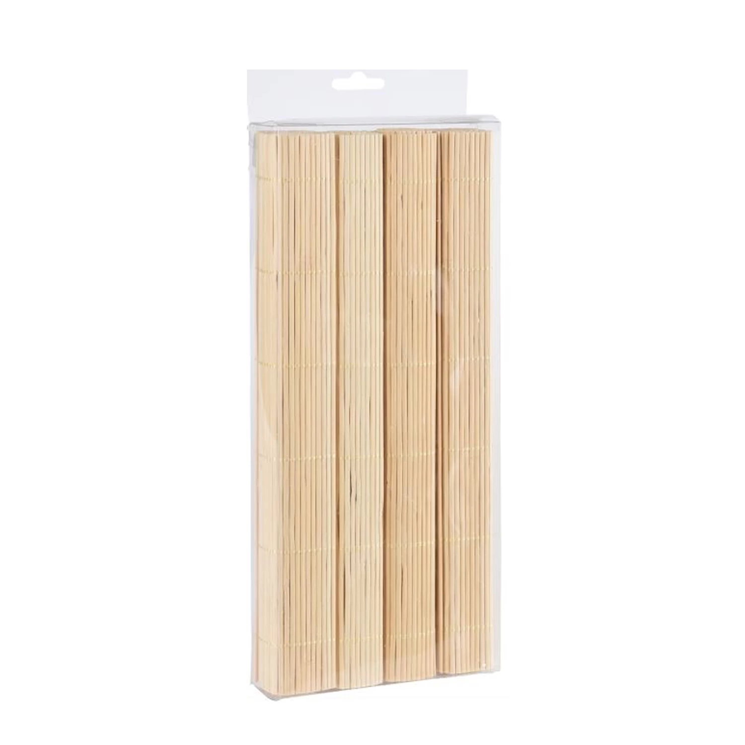 Det set van 4 bamboe placemat’s beschermen je tafel tegen vuil en beschadigingen tijdens het eten. Ook zorgen ze voor een mooie achtergrond voor servies en het bestek. Opgerold nemen de placemat’s weinig ruimte in beslag en passen ze gemakkelijk in een lade.