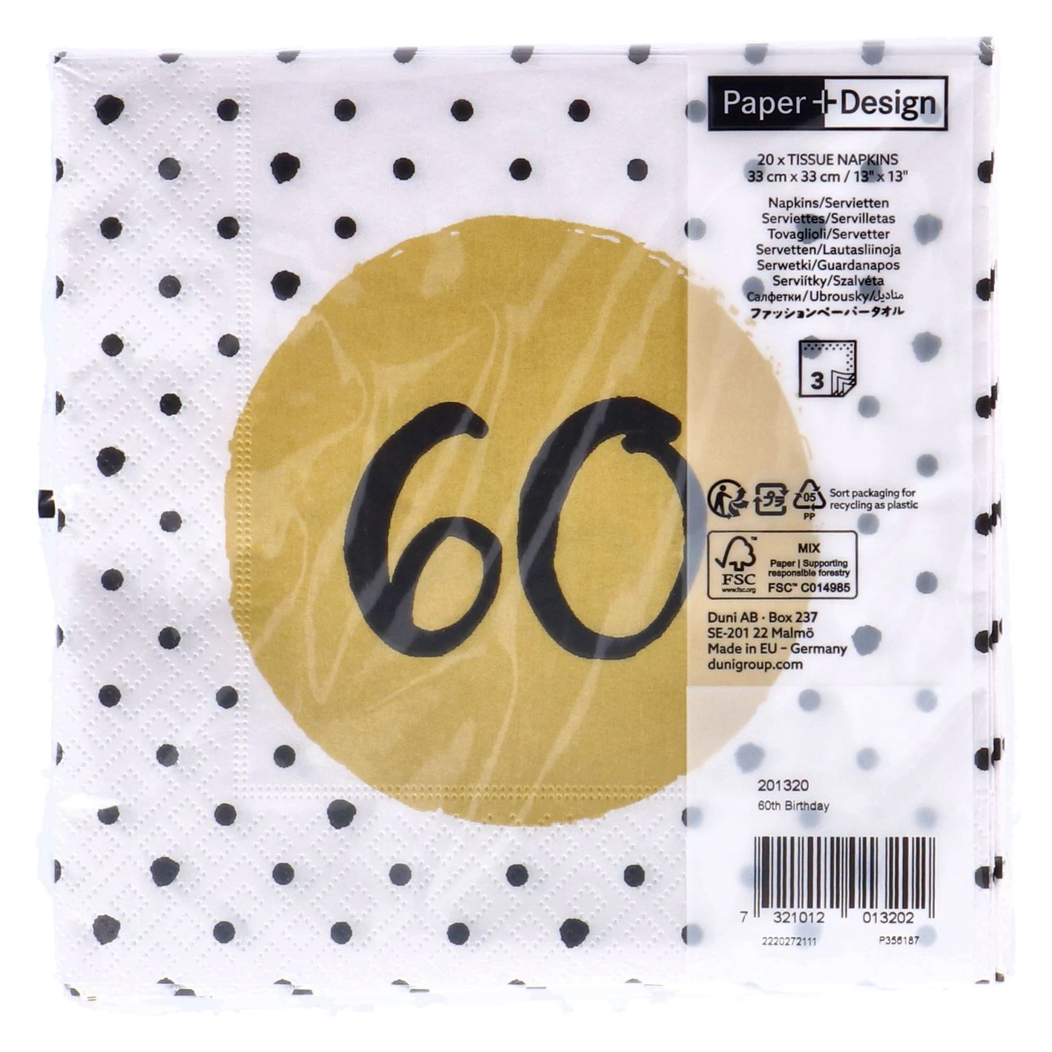 Servetten zijn een uitstekende manier om jouw eettafel net een beetje extra stijl mee te geven! Met deze Duni servetten, bedrukt met zwarte stippen en het getal 60 in een gouden cirkel op wit papier, maak jij jouw gedekte tafel helemaal af! De servetten zijn gemaakt van 3-laags tissuepapier en hebben een formaat van 33cm. De verpakking bevat 20 servetten, zodat jij genoeg hebt voor iedereen!