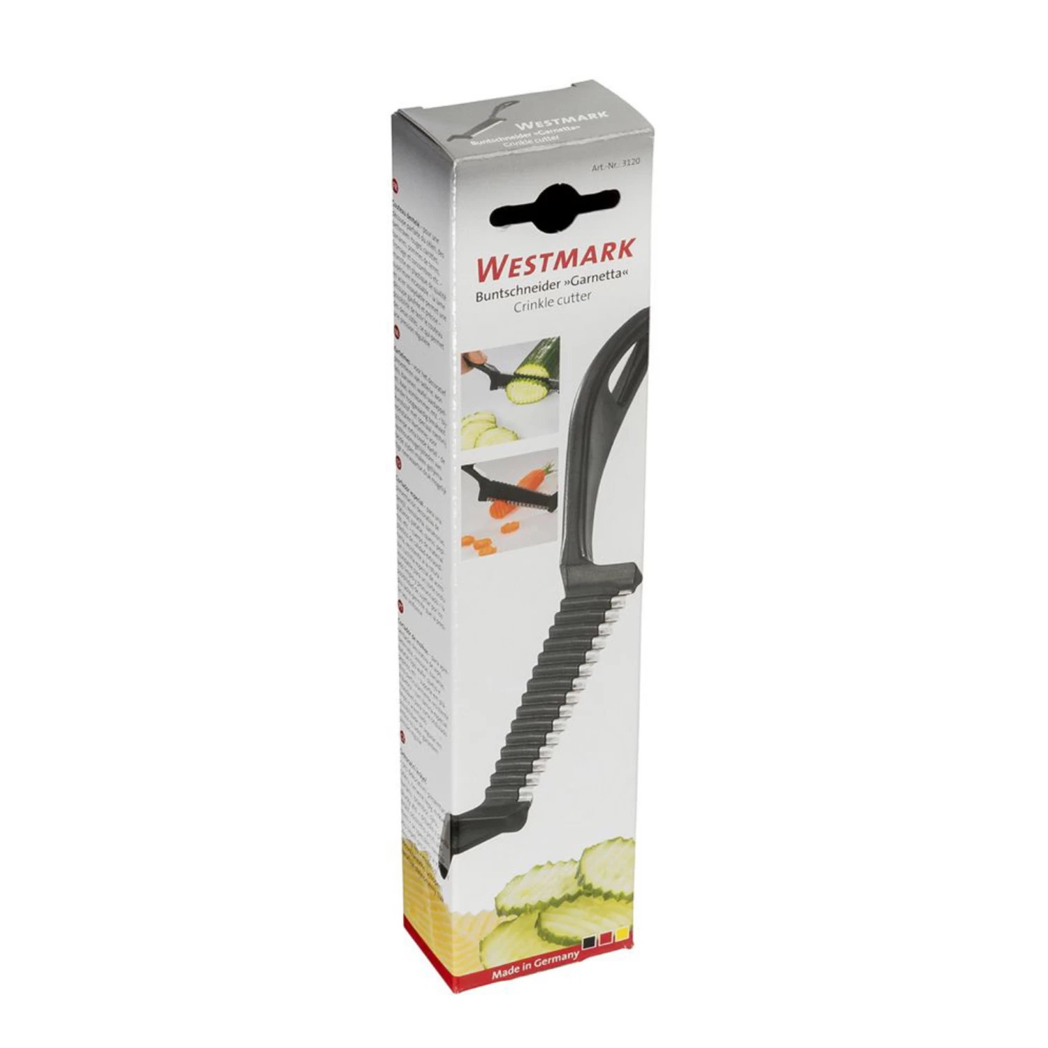 Met het praktische Westmark Garnetta groentemes voeg je snel een decoratieve golvende snede toe aan groenten, fruit of kaas. Dankzij het scherpe speciale mes van roestvrij staal en de twee handvatten is dit bijzonder gemakkelijk en veilig, zelfs bij hardere groenten. Tover gezonde decoraties voor buffetten, of zelfgemaakte groentechips als fingerfood voor uw feest.